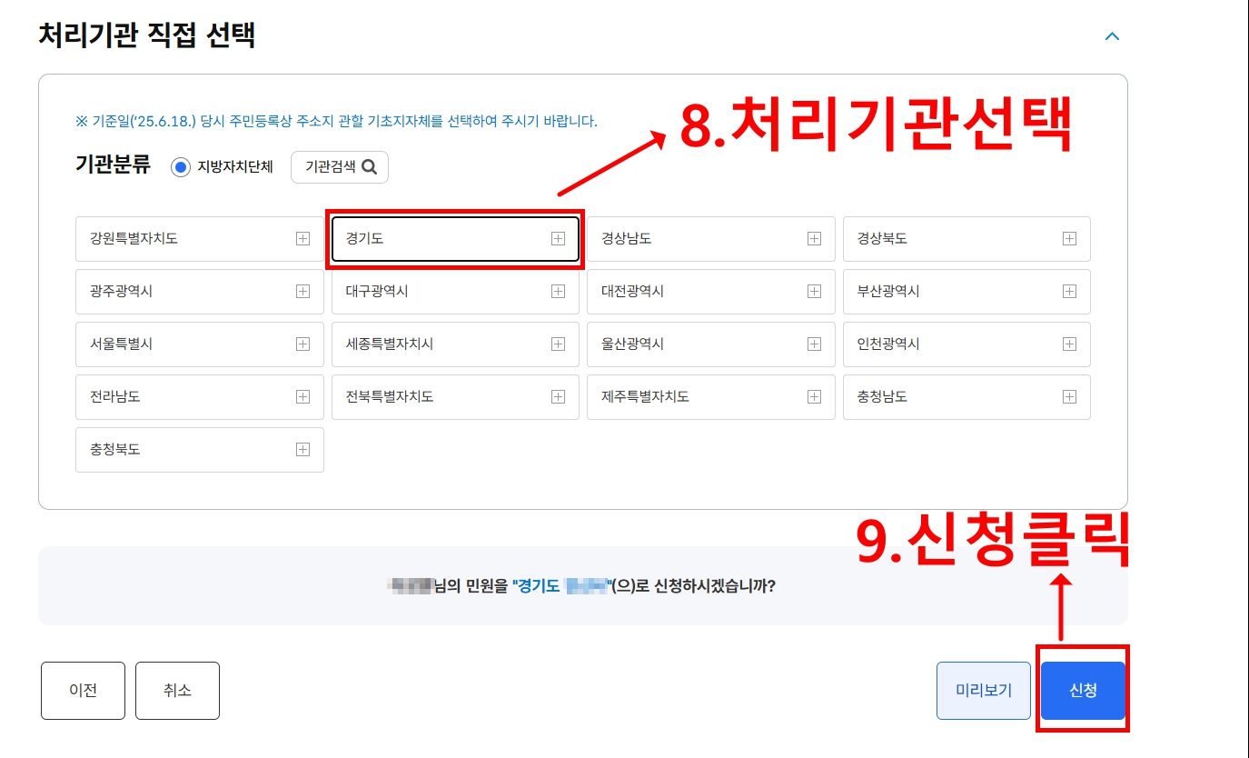 - 기관 선택 및 신청: 마지막으로 2025년 6월 18일 기준 주민등록상 주소지 관할 기초지방자치단체로 신청하면 끝입니다.