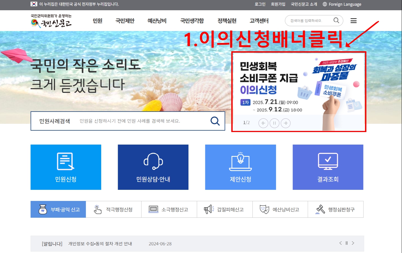 민생회복 소비쿠폰 지급에 이의가 있는 국민은 지급 금액이나 기타 사유로 인해 이의신청을 할 수 있어요. 전체 절차는 국민신문고 웹사이트에서 온라인으로 진행하고 있어요. 바로 아래에 있는 바로가기를 클릭해보세요.