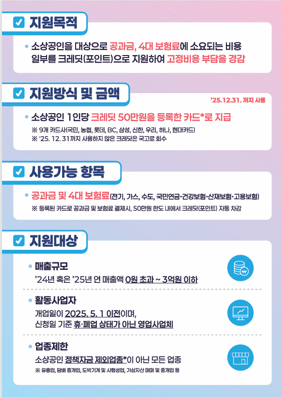- 현재 영업 중인 소상공인: 사업자등록증 기준으로 2025년 5월 1일 이전에 개업한 사업자여야 해요.