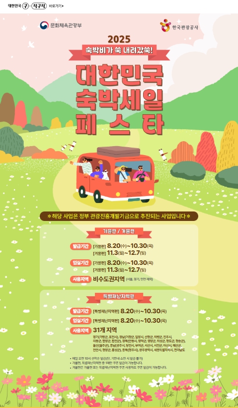 - 8.20.부터 본격적인 시작 : 문화체육관광부와 한국관광공사가 함께 가을과 겨울 국내 여행 수요를 늘리고, 지역 경제에 활력을 불어넣기 위해 2025년 하반기 '숙박세일페스타'를 시작
