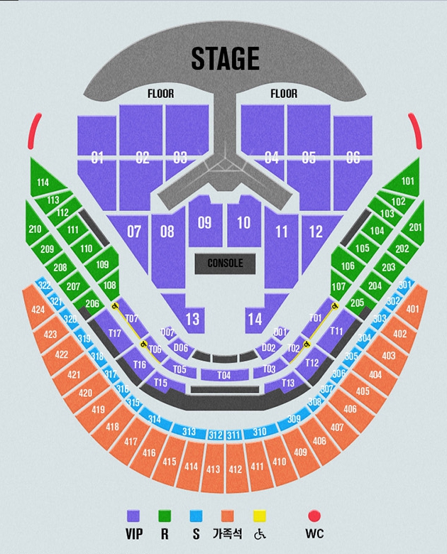 - SR/R석 : VIP 뒤, 중앙 및 측면 블록, 가장 인기 많음