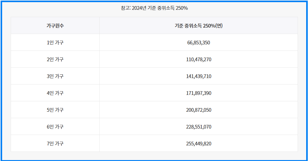 - 가구 소득: 가구원 수에 따른 기준 중위소득 250% 이하여야 해요.